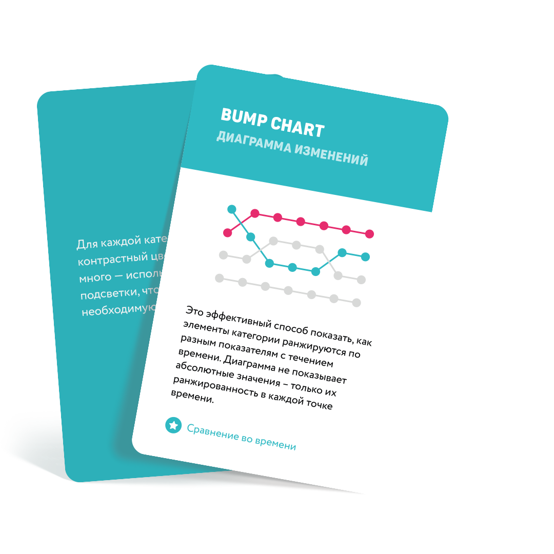 Мы написали, нарисовали и напечатали 47 карточек с наиболее востребованными видами визуализации данных и собрали их в один набор, который помещается в визитницу и поддержит вас в минуты трудности и визуального отчаяния